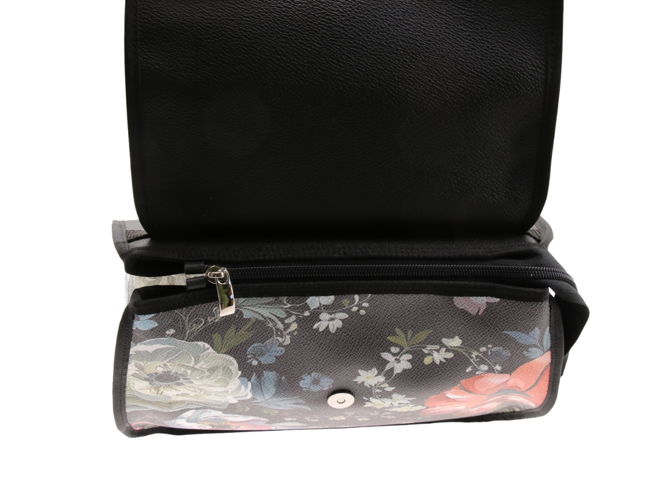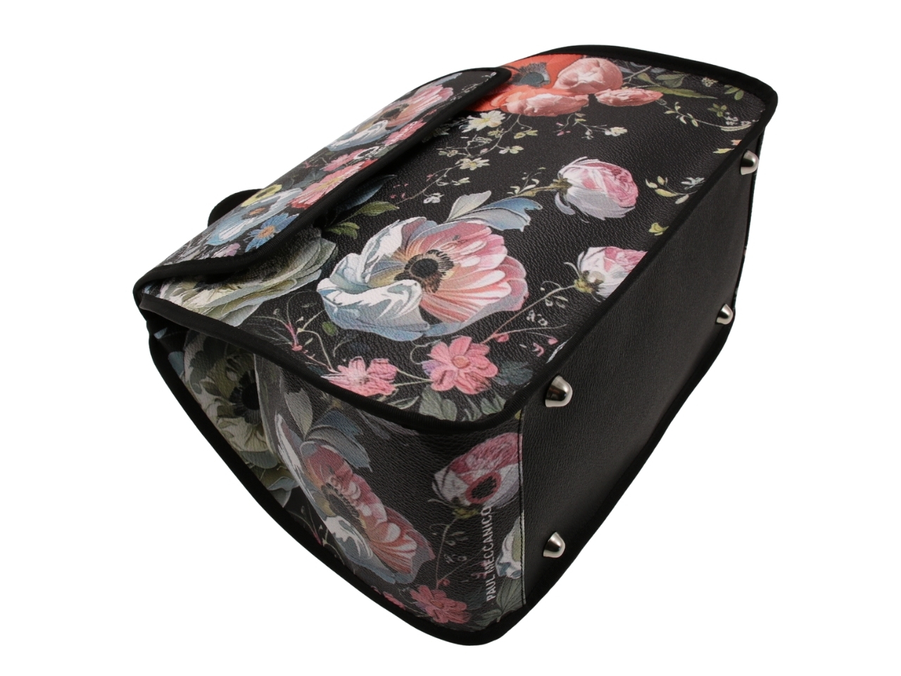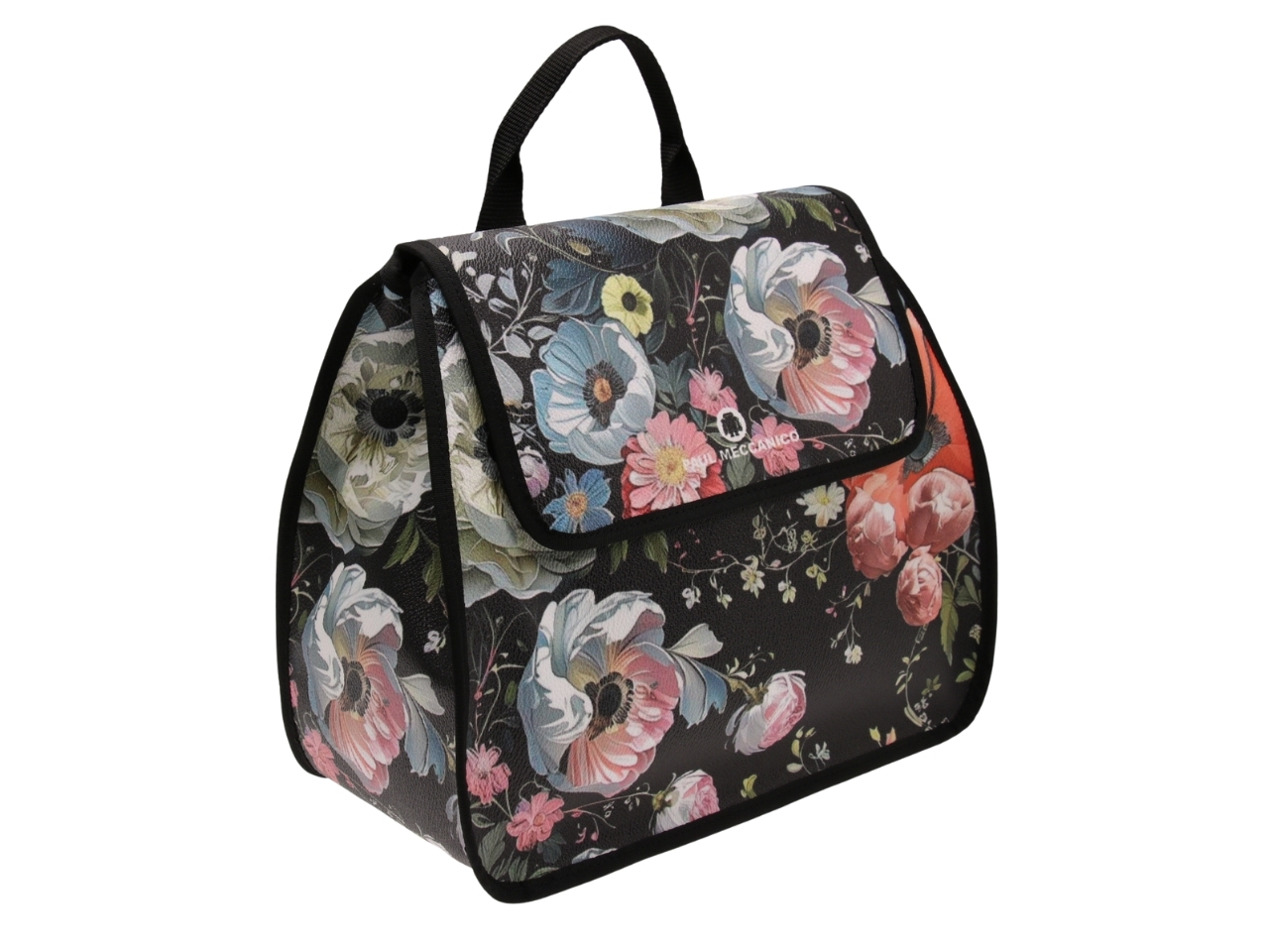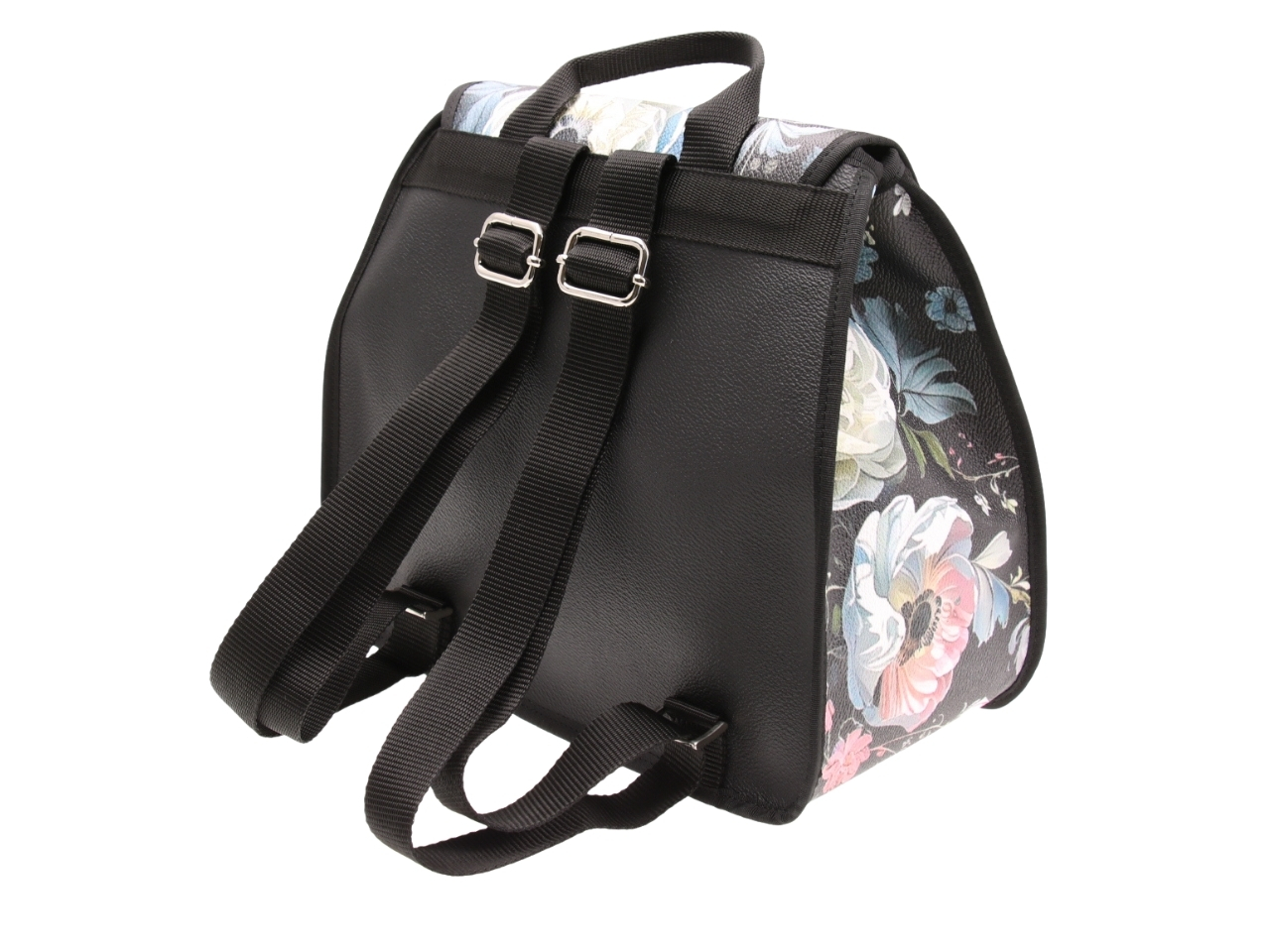 BLACK WOMEN’S “BACKPACK” WITH FLORAL FANTASY. MODEL PULP MADE OF HAMMERED VEGAN LEATHER.