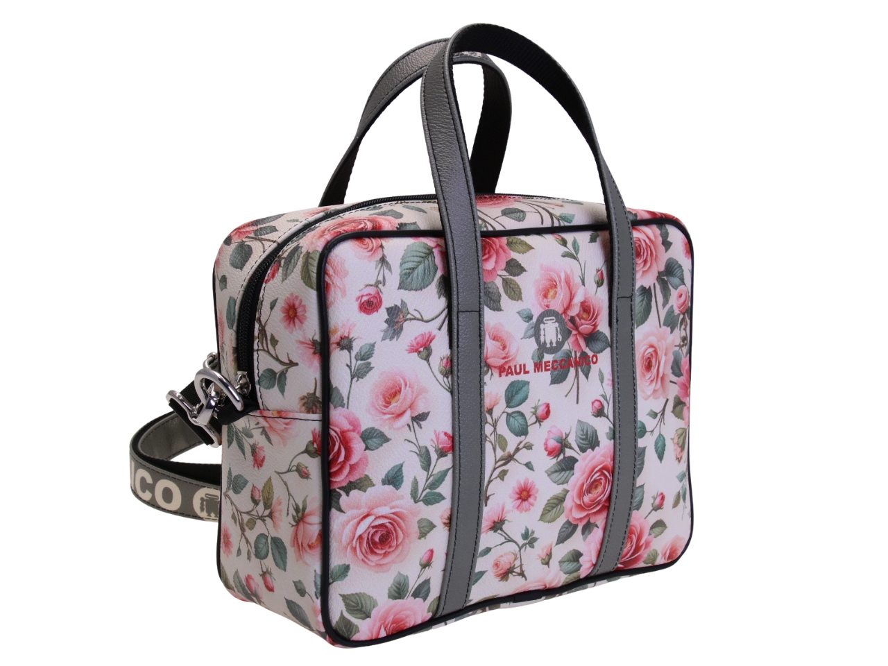 WHITE RECTANGULAR WOMEN’S BAG WITH FLORAL FANTASY. MODEL PINCA MADE OF HAMMERED SYNTHETIC LEATHER.