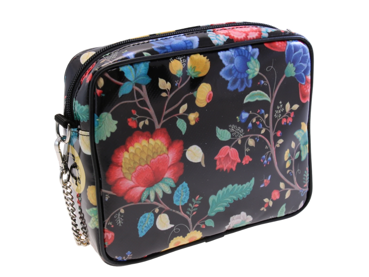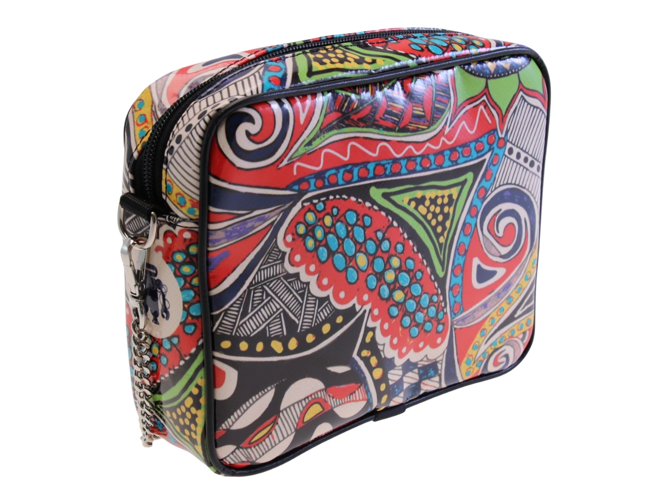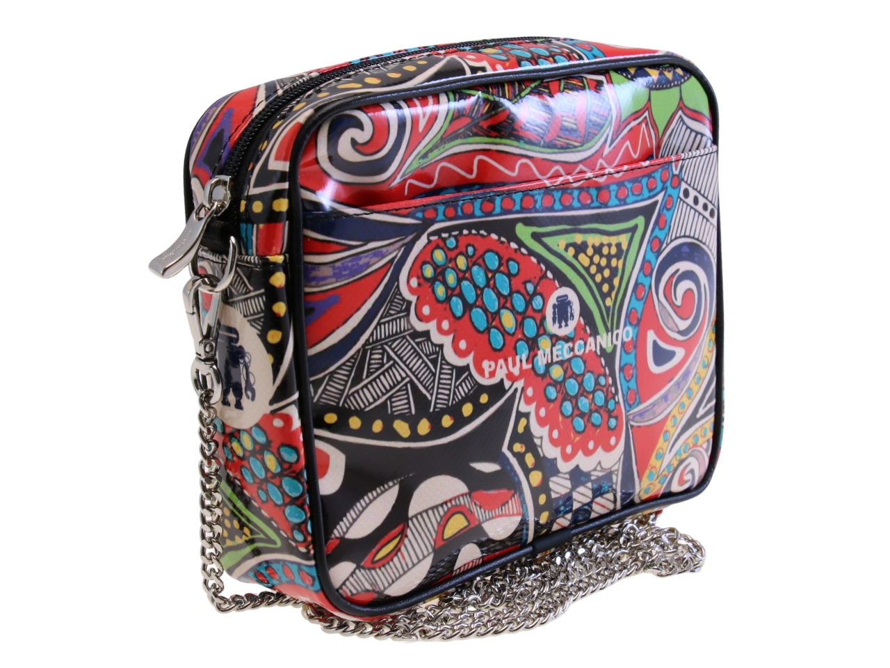 FUCHSIA AND WHITE RECTANGULAR WOMEN’S BAG “STRAWBERRIES”. MODEL PINCA MADE OF LORRY TARPAULIN.