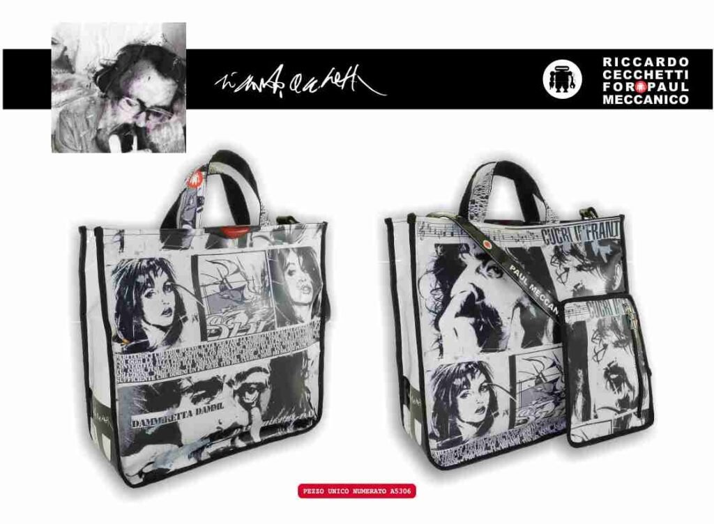 Riccardo Cecchetti for Paul Meccanico The Paul Meccanico tote bag, equipped with shoulder strap, removable pouch and safety reflector, designed by the well-known cartoonist Riccardo Cecchetti, was born as a unique piece in the world (uniqueness code number A5306).