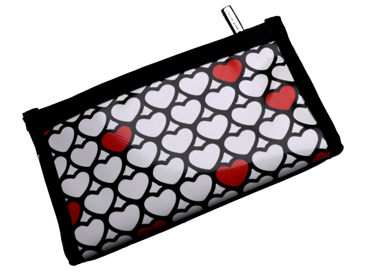 LARGE WOMEN’S WALLET BLACK, WHITE AND RED “HEARTS”. MODEL PIT MADE OF LORRY TARPAULIN.