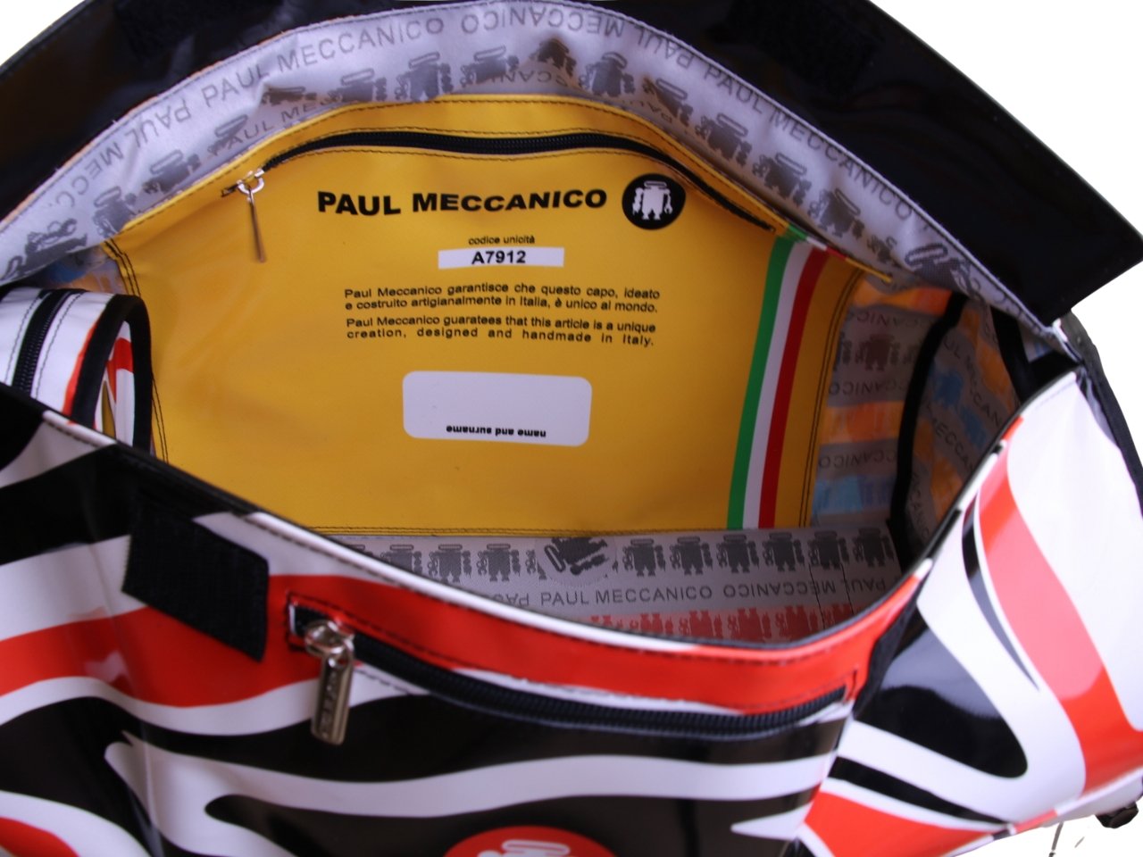 - Inside: The main large and accessible compartment with the signature removable and portable (round-shaped zip pouch, 1 velcro pocket and 1 zip pocket 1 external zip pocket (under the flap closure).